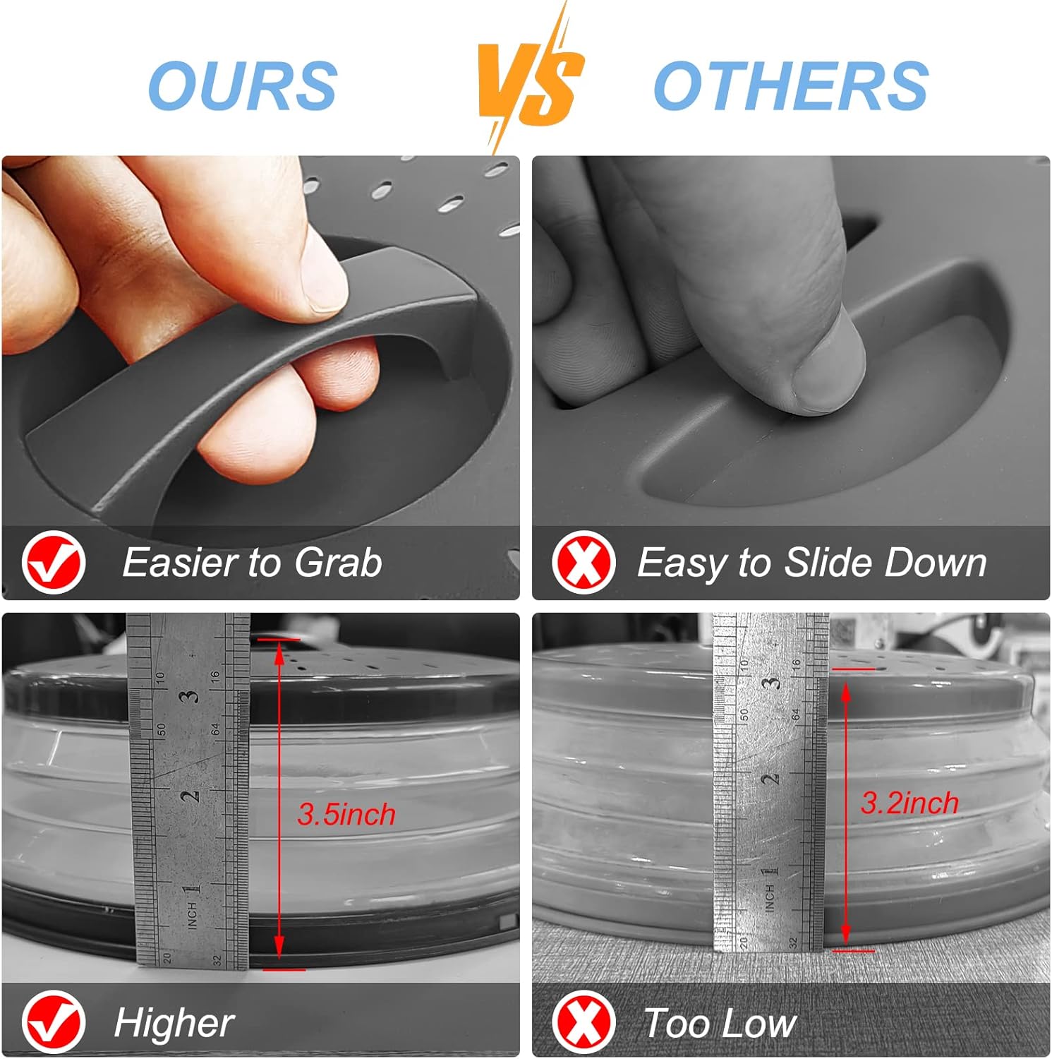【Easy To Grid】LekDrok Microwave Lid is designed by a Easy-Grid-Handle. It is easy to fetch the cover out of microwave without burning hands compared to others grid-handle which is short and easy to slip.